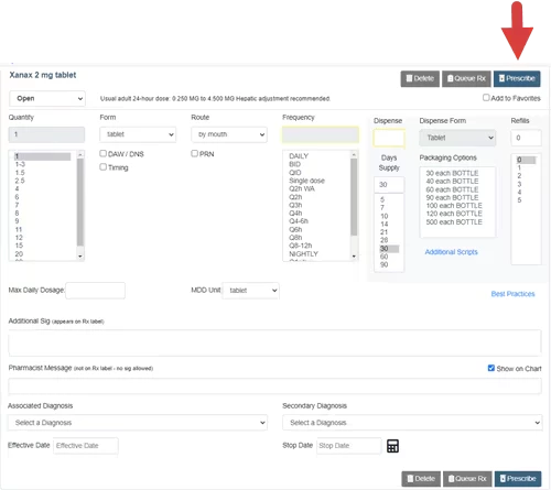 - Fill in Sig Directions and Dispense Information, then click the Prescribe button.