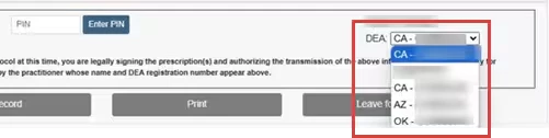 - Optional: Click the DEA drop-down to prescribe under a different DEA number.