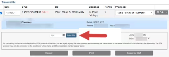 - Enter your EPCS PIN and click the Enter PIN button in the Transmit Rx window.
