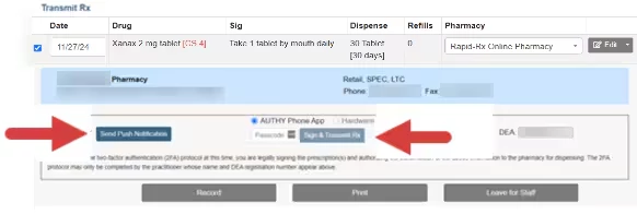 - Use your OTP device (Hardware Token or Authy Application) to enter the Passcode for two-factor authentication. This can be entered manually or by Push Notification. Click the Send Push Notification button to use a Push Notification, or enter the Passcode manually and click the Sign & Transmit Rx button.