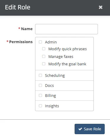 The Admin role includes three individual permissions by default: Modify quick phrases, Manage faxes, and Modify the goal bank. If needed, you can configure these permissions separately for non-admin user groups.