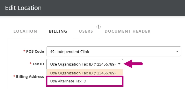 Clinics with multiple tax IDs can assign a different tax ID and billing address to each location in the system. This supports accurate claims, remits, and reporting by using the correct tax ID for each location. For general location settings, see Locations for more information.