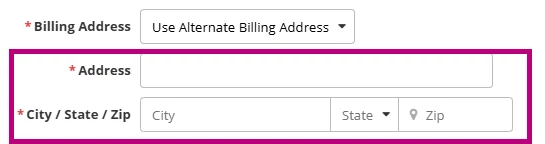 - In the Address and City/State/Zip fields, enter the Alternate Billing Address.