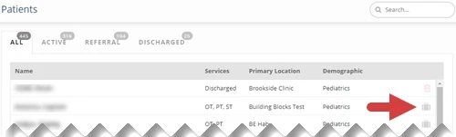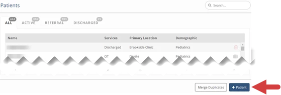 Use the Patient List to access a complete list of patients and their charts (including referrals and discharged patients) for all therapists and locations. You can add, merge, quick-discharge and delete patients using the patient list. Scheduling, Billing and Docs permissions give users the ability to open and document in patient charts from the schedule or by using the patient search, but only users with Admin permissions can add and manage patients from the Patient List.