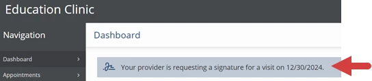 Your clinic may use the patient portal to request a visit signature to confirm that services were provided during a visit. When visit signature is requested, you will receive an email asking you to log in to the patient portal to provide a signature. Click the link in the email to log in to the patient portal and provide a digital visit signature.