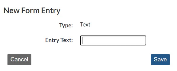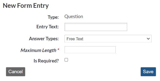 NOTE: Entry Text is a required field. This will display directly above the free text field. Check spelling and formatting as this is not editable once saved. To make changes, it must be deleted and recreated