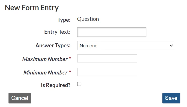 NOTE: Entry Text is a required field. This will display directly above the Numeric field. Check spelling and formatting as this is not editable once saved. To make changes, it must be deleted and recreated.