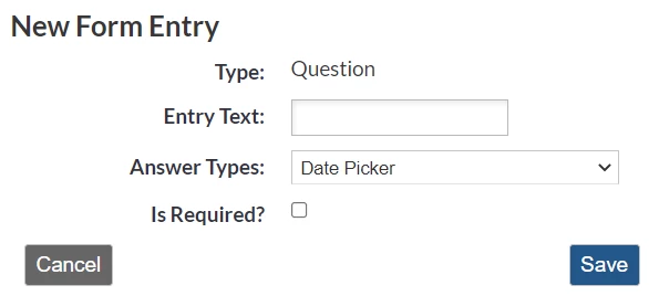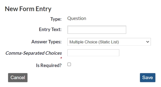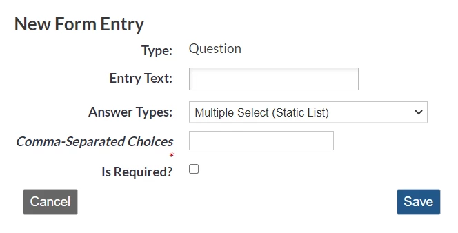 NOTE: Entry Text is a required field. This will display directly above the Multiple Select. Check spelling and formatting as this is not editable once saved. To make changes, it must be deleted and recreated.