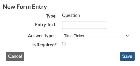 NOTE: Entry Text is a required field. This will display directly above the Time Picker. Check spelling and formatting as this is not editable once saved. To make changes, it must be deleted and recreated.