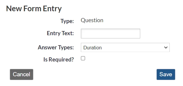 NOTE: Entry Text is a required field. This will display directly above the Duration field. Check spelling and formatting as this is not editable once saved. To make changes, it must be deleted and recreated.