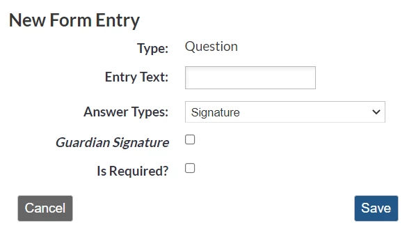 NOTE: Entry Text is a required field. This will display directly above the Signature field. Check spelling and formatting as this is not editable once saved. To make changes, it must be deleted and recreated.