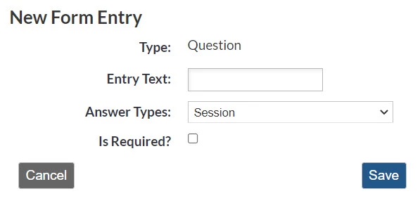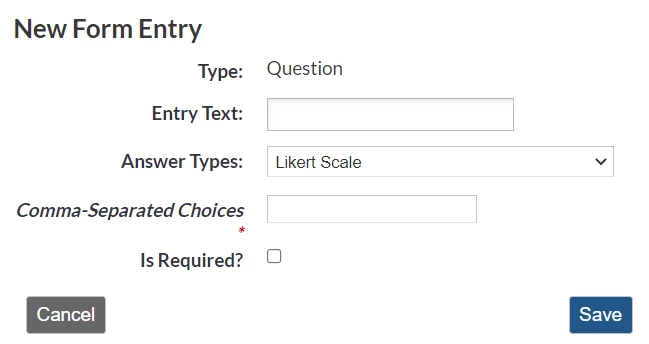 NOTE: Entry Text is a required field. This will display directly above the Likert Scale. Check spelling and formatting as this is not editable once saved. To make changes, it must be deleted and recreated.