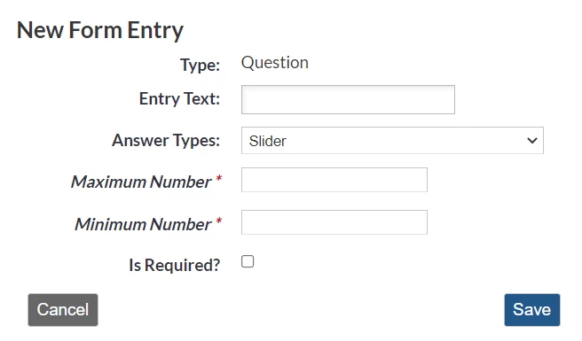 NOTE: Entry Text is a required field. This will display directly above the Slider. Check spelling and formatting as this is not editable once saved. To make changes, it must be deleted and recreated.