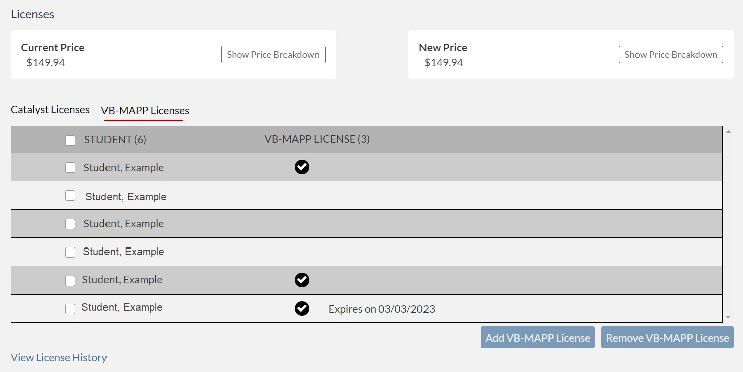 - There will be two tabs: Ensora Data Collection Licenses and VB-MAPP Licenses. Select the option you wish to view. Students without Licenses will not have a checkmark next to their name. Students with Licenses will have a checkmark next to their name.