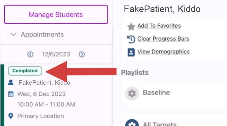 Each student/client appointment will show a green Completed banner indicator once a SOAP Note has been Published with a Session/Appointment assigned. For more information on SOAP Note Session Matching see SOAP Note Session-Matching.