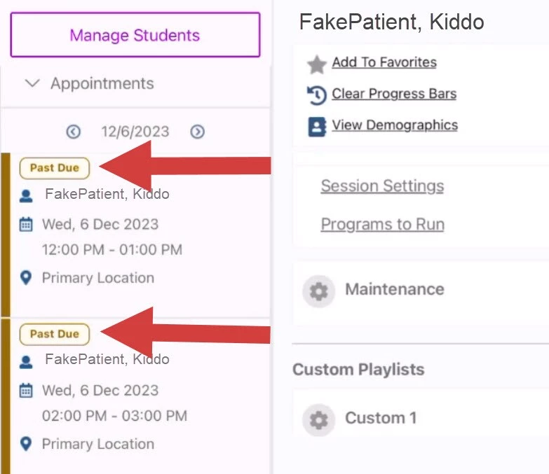 Each appointment will show a gold Past Due banner indicator once the end time of the Session has passed without a SOAP Note being Published.