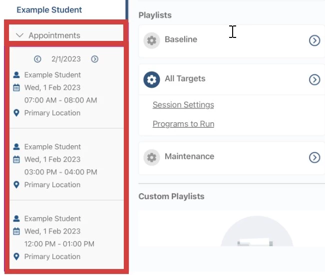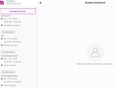Users will see their student/client appointments and non-client events that were added in an integrated PMS in the system app on the Student Dashboard (Student Selection) screen under Appointments. The criteria for the appointments and non-client events to display is: