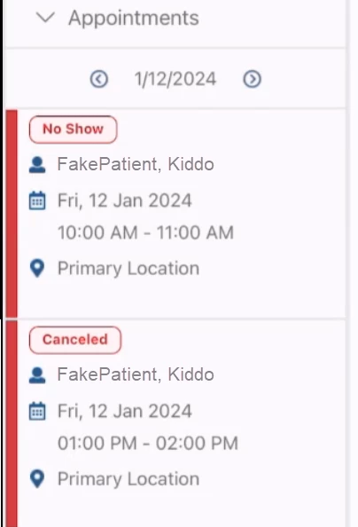 Each appointment will show a red No Show or red Canceled banner indicator if the appointment has been marked as Canceled or No Show in the PMS or changed via the system app.