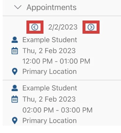 You can use the Forward/Backward Arrows to see appointments 14 days in the past and 14 days in the future.