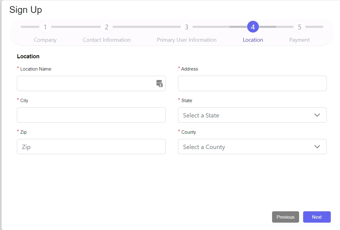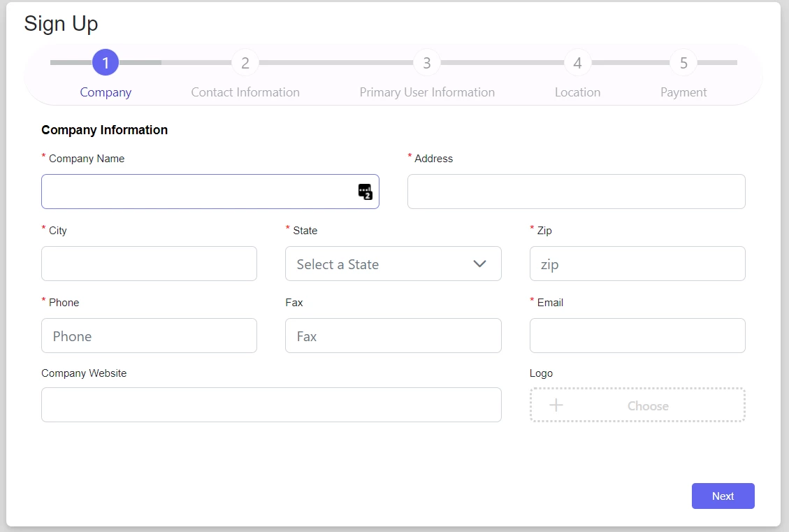 - Add your Company's information. All fields noted with a red asterisks are required fields. Click Next to move onto the next step.