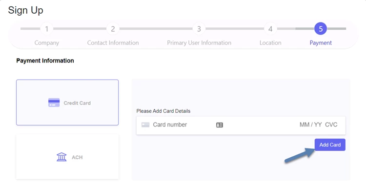 - Add your preferred payment method. You can add a Credit Card or ACH information. Click Add Card (or ACH).