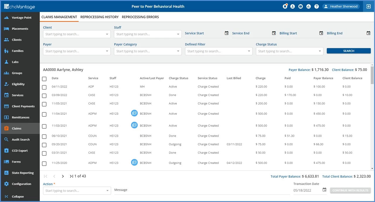 - Claims Management - Like the Create tab, Claims management allows claims to be selected individually or in groups for rebilling, reprocessing, or reversing.