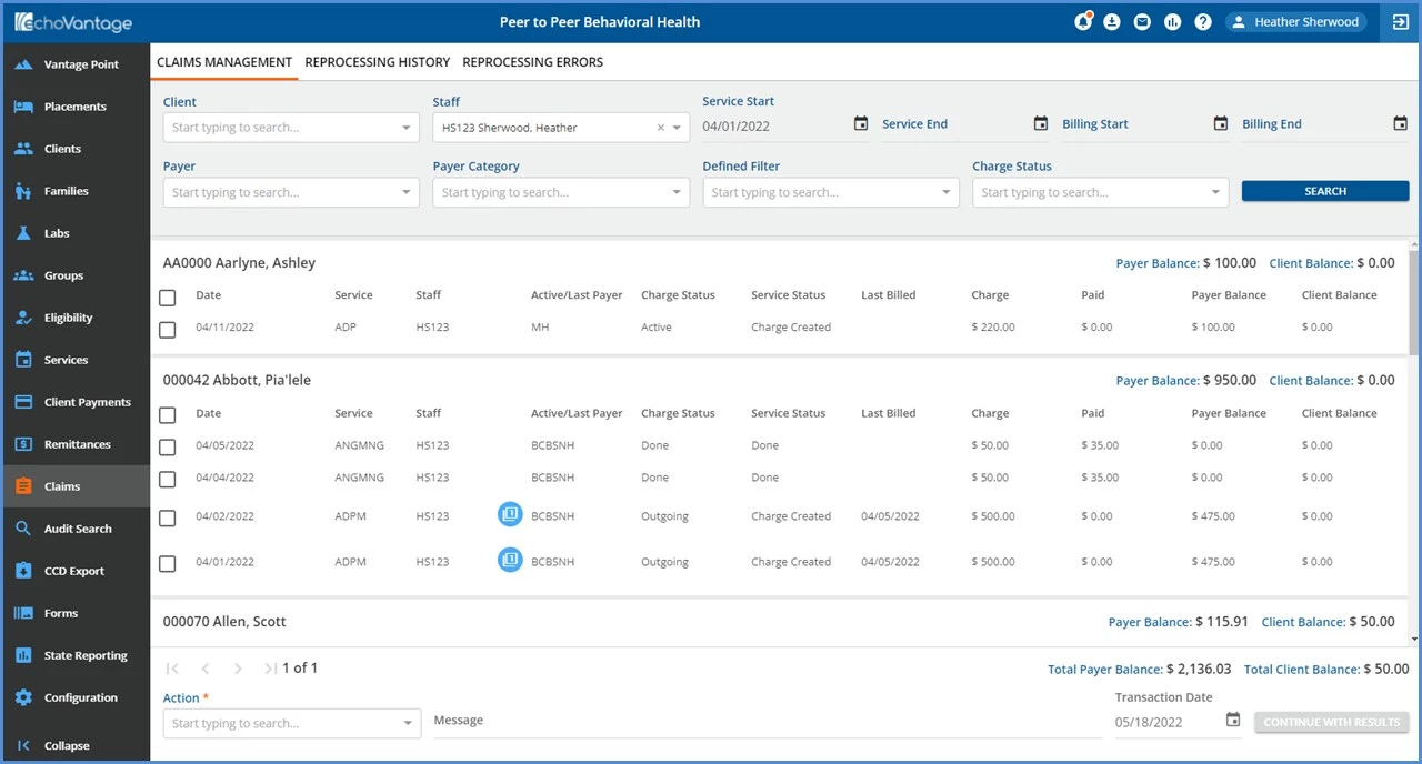 A Claim row includes Service Date, Service, Staff, Active/Last Payer, Charge Status, Service Status, Last Billed, Charge, Paid, Payer Balance, and Client Balance information. A Claim's summary information is updated as the Claim moves through the billing process.