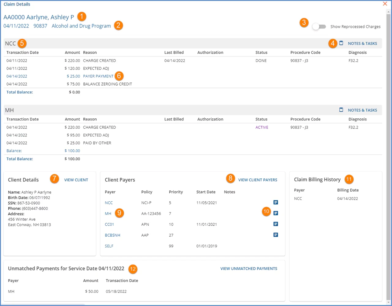 12. The Unmatched Payments section lists any unmatched payments, non-specific payer payments that are specific to a Client and Date of Service but did not match a charge.