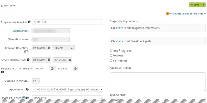 NOTE: If you leave the page without pressing the green Save button, you can still retrieve the Note by clicking View Draft Copies of This Note. Loaded drafts disappear after the Note is saved. Learn More: Access Document Drafts