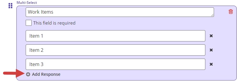 The Multi-Select Box allows you to create multiple responses. Users can then select one or more responses (users are required to select at least one response). Click Add Response to enter more.