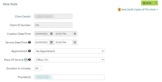 Dynamic Progress notes are accessed when creating a new Progress Note client Notes page.