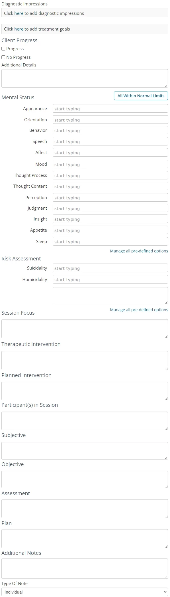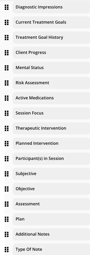 Dynamic Progress Note forms allow you to create a customized progress note for client appointments and treatment plans. Progress Notes are linked to a specific client and appointment. You can create custom progress notes that are designed specifically for a particular service type depending on the notes that need to be kept for that appointment. The Dynamic elements automatically pull information from the Client profile and case information. Learn More: Case & Notes Overview