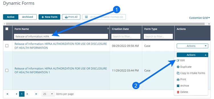 - Navigate to Dynamic Forms and locate your duplicate GFE template by searching the Form Name or scrolling through the list.