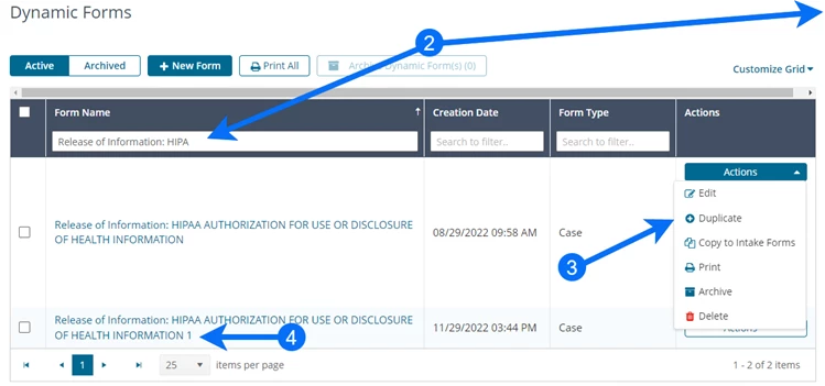 - Click Actions and select Duplicate button for desired Dynamic Form.