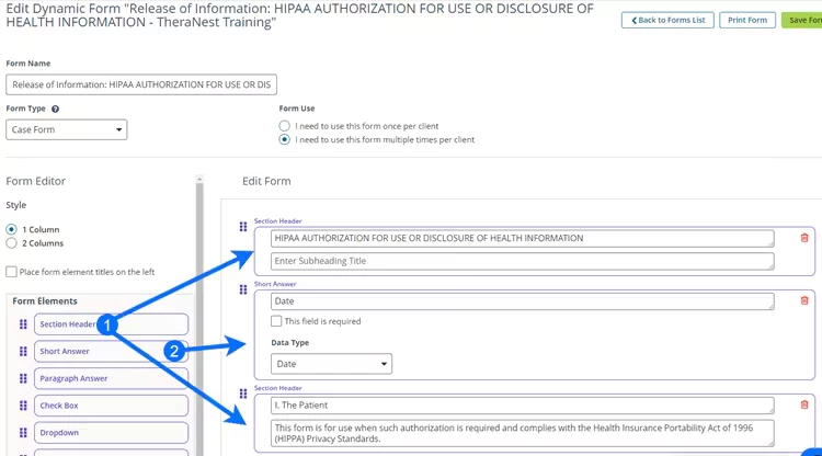 - HIPAA AUTHORIZATION FOR USE OR DISCLOSURE OF HEALTH INFORMATION is the form title which will appear on all forms. This may be modified and you may add your practice name in the Subheading Title below. Keep in mind that it will appear on the form for ALL clients unless edited.