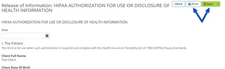 It will contain the Client Full Name, Date of Birth and Client ID number, the rest will be blank. You can then save the form and use the print function to create a pdf to print and provide to the client as hard-copy or sent via secure messaging. - add to your Intake Forms. Clients can complete it and return electronically through the Client Portal. It will be saved in their General Documents tab in Client Details.