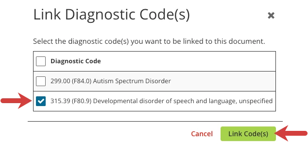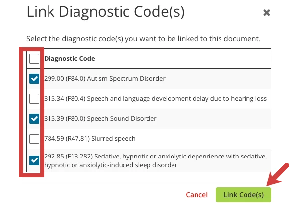 - Select diagnosis code(s) you would like on the treatment plan and click Link Code(s).