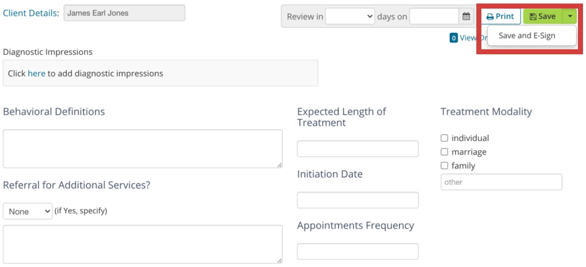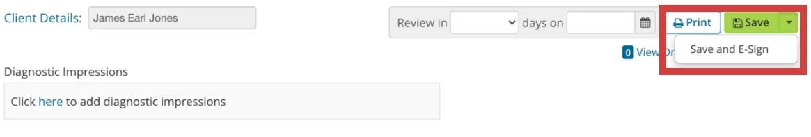 - Click Save or the drop down on the Save button and select Save and E-Sign.