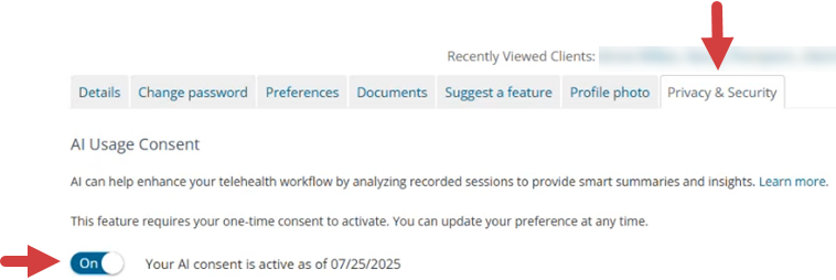 Before you can begin recording telehealth sessions for AI Telehealth Notes, you must turn on AI Usage Consent in your profile.