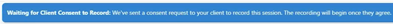 A banner at the top indicates that you are waiting for the client to consent. After the client provides consent, the banner indicates that recording has started. A red banner displays if the client declines consent.