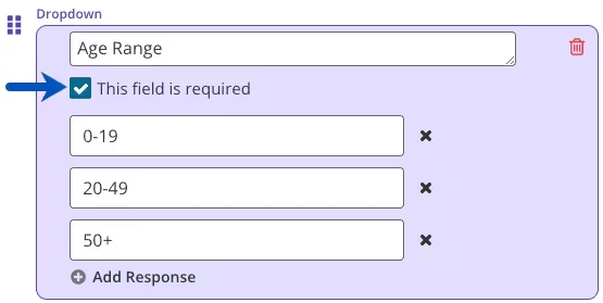 Dropdown allows you to add a multiple choice selection. Add dropdown responses in the order you would like them displayed to Client. Select checkbox if you would like to make this a required field.
