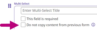 Some form elements have a Do not copy content from previous form checkbox. When copying from a previous form or note, if this setting is checked, the content from within this field will not copy forward into the newly created note. This setting is always unchecked by default for existing and newly created forms.