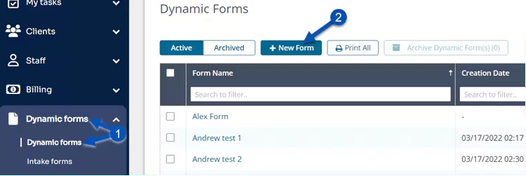 PERMISSIONS REQUIRED: You must have Therapist Permissions with Dynamic Forms checked or higher. See Staff Permissions Glossary for more information.