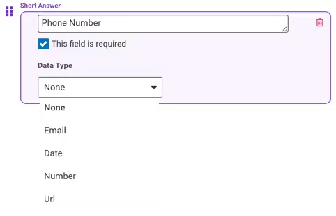 This adds a field for short answers. Text box is for one word answers such as email address, date, number or URL. Dashes and special characters are not allowed in text boxes.