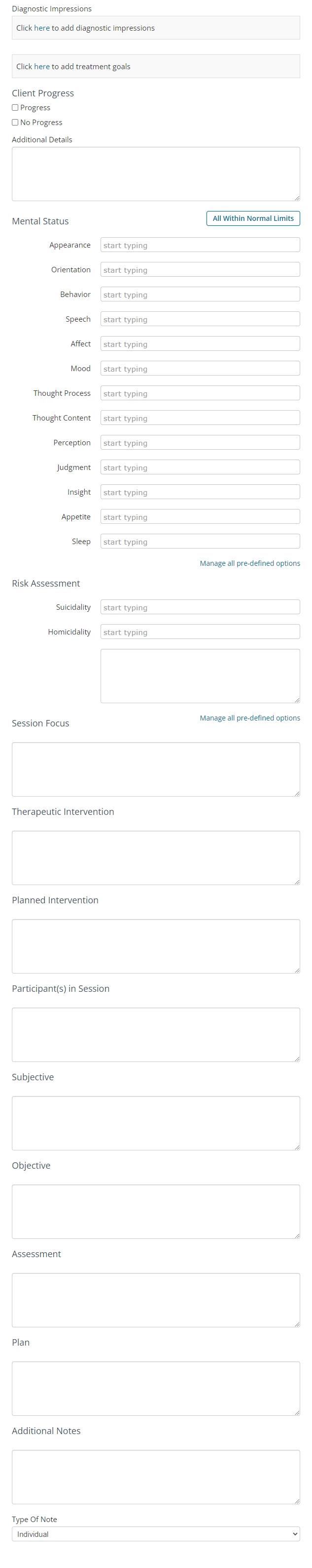 Dynamic Progress Note forms allow you to create a customized Progress Note for client appointments and treatment plans. Progress Notes are linked to a specific client and appointment. You can create custom progress notes that are designed specifically for a particular service type depending on the notes that need to be kept for that appointment. The Dynamic elements automatically pull information from the Client profile and case information. See Client Cases & Notes: Overview for more information.