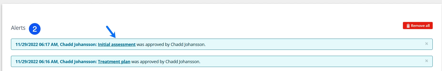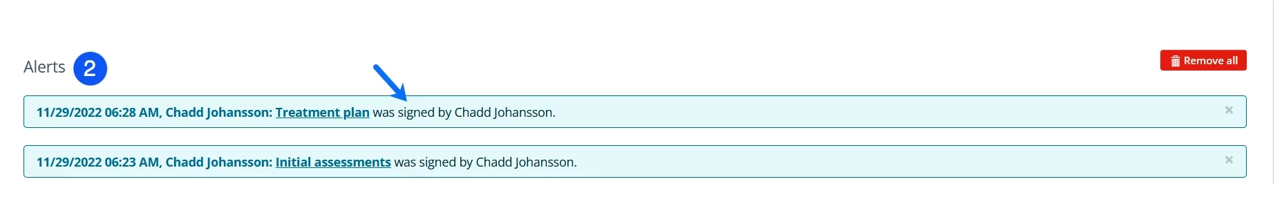 If you need to review assigned staff Initial Assessments, Treatment Plans or Progress Notes, you will receive an alert when your Supervisee submits a Progress Note for review via the bell icon on the top menu. Staff will also receive notifications when documents are approved and signed.