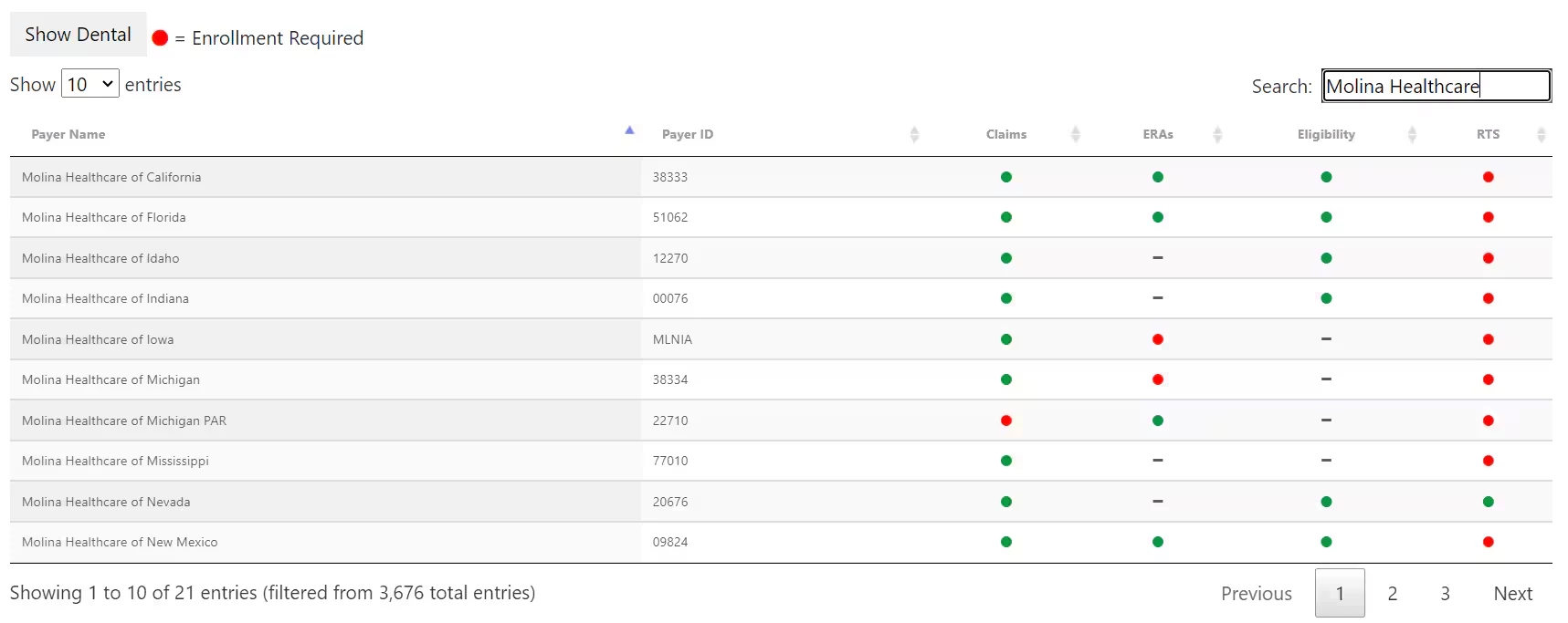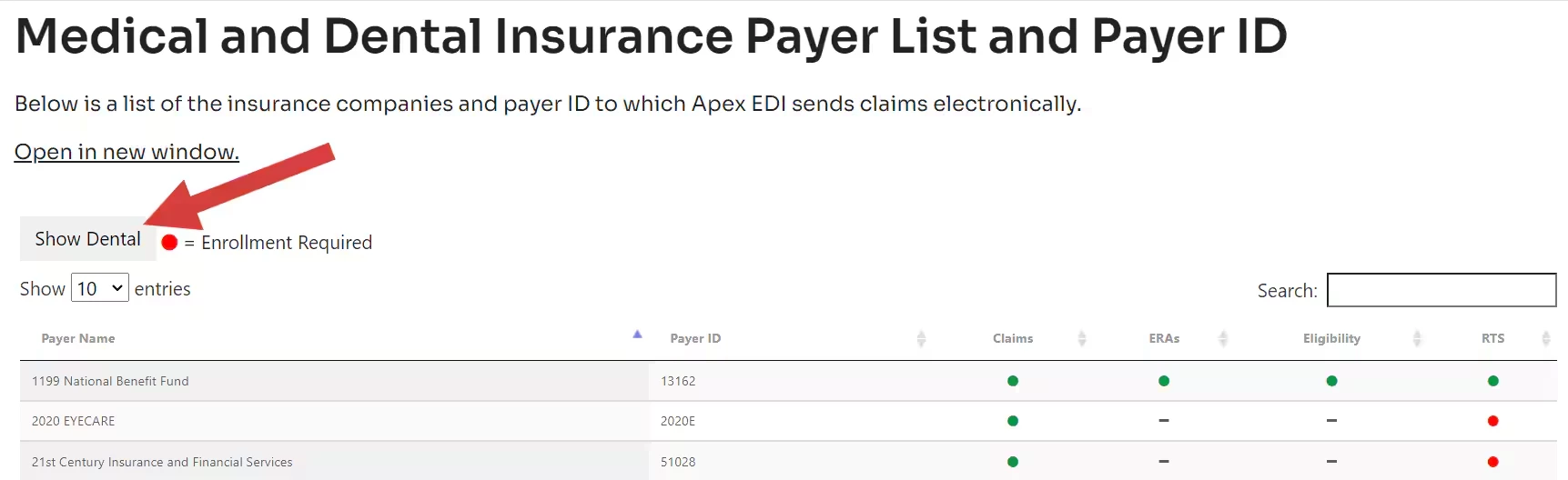 In the upper left corner, you will see a button that you can use to toggle between the Medical and Dental Payer Lists. If the button reads "Show Dental," as in the example above, this indicates that you are looking at our Medical Payer List. Conversely, when the button reads "Show Medical," this means you are currently viewing our Dental Payer List.