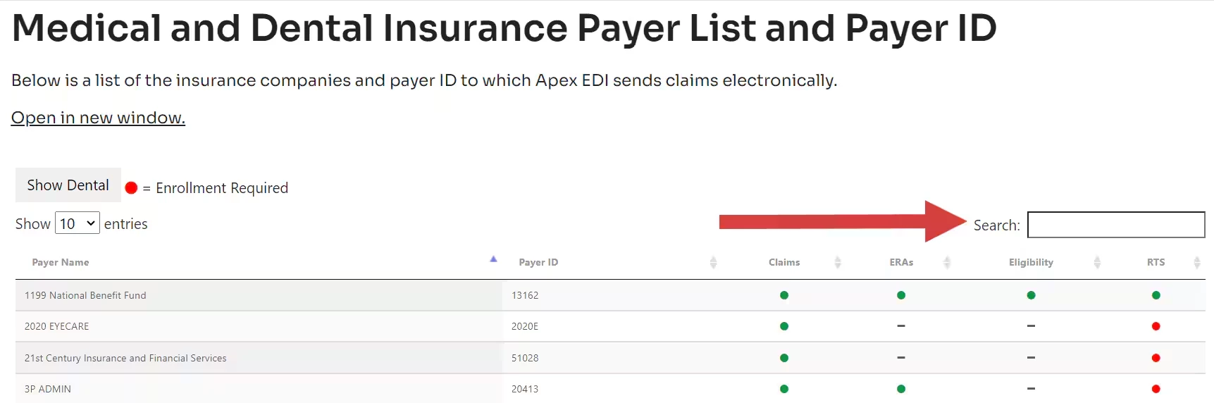 The second way to find our payer list does not require you to be logged into your account. Go to the website by clicking this link onetouch.apexedi.com/secure/HelpCenter/PayersListDataTables.html,
