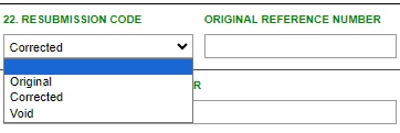 Once you have either the ICN or Payer Control Number, click the drop-down in box 22 to select Original, Corrected or Void. Then enter the ICN or Payer Control Number in box 22 under the original reference number.