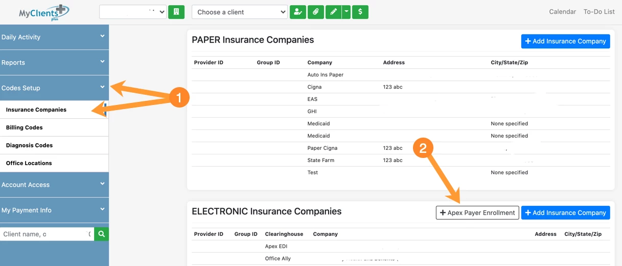 - Click Codes Setup inside menu and select Insurance Companies.